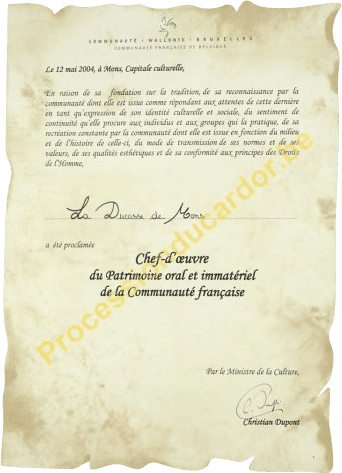 Depuis 2005, la Procession du Car d’Or a été reconnue comme Patrimoine Mondial et Immatériel de l’Humanité par l’UNESCO, dans la catégorie Géants et dragons processionnels de Belgique et de France.